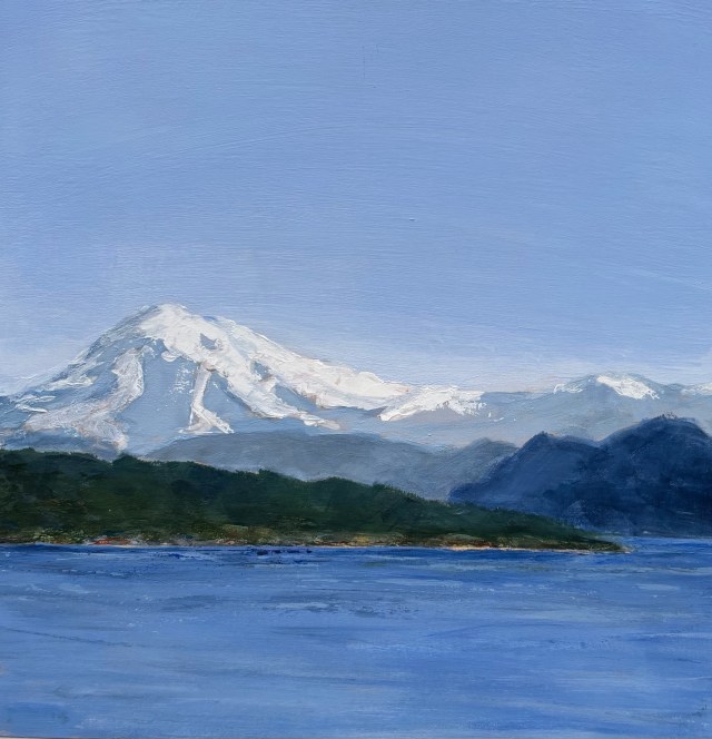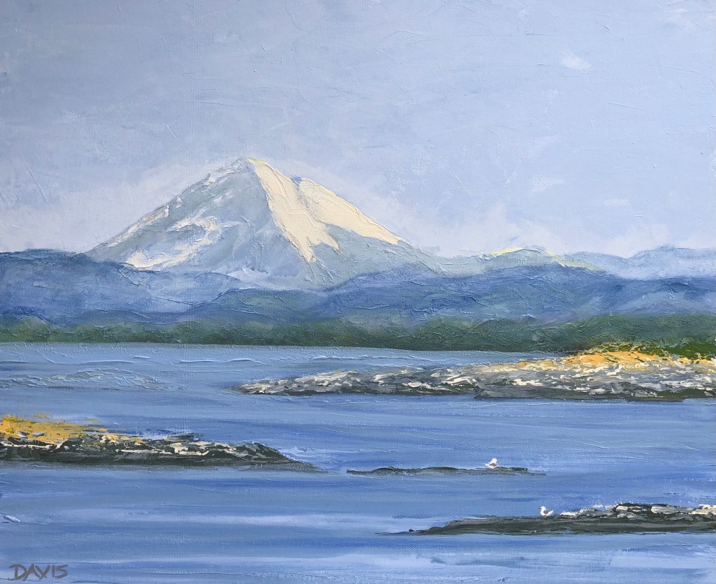 Mount Baker lies at the heart of the Pacific Northwest — no matter where you go, its dramatic slopes anchor this landscape. My goal is to paint it from north, south, east and west, but my initial efforts are all from BC’s Gulf Islands.