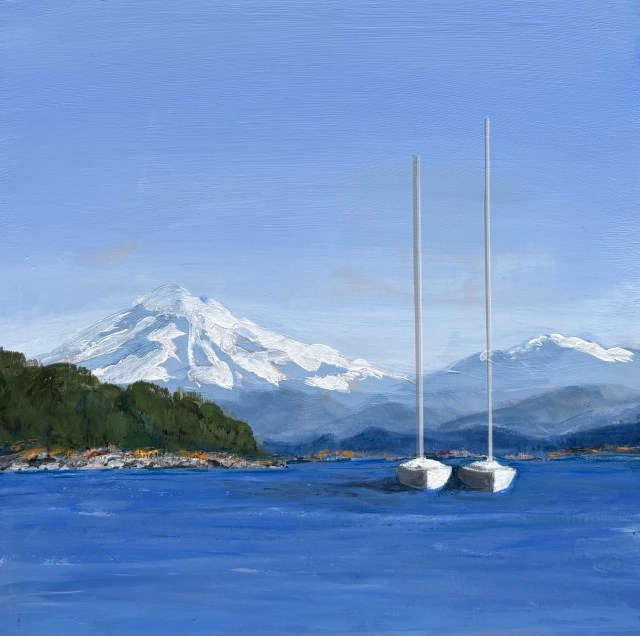 Anchored at Sucia, 36 x 30″ acrylic on canvas, 2022. Available.Mount Baker from Sidney Harbour, 18 x 24, acrylic on canvas, 2016. Sold.Approaching the San Juans, 20 x 28″ acrylic on canvas, 2017. Sold.Gulls off San Juan Island, 18 x 24″ acrylic on canvas, 2018. Sold.Mt Baker from Discovery, 24 x 20″ acrylic on canvas, 2023. Sold.Heading Out, 24 x 48″ acrylic on canvas, 2019. Sold.
